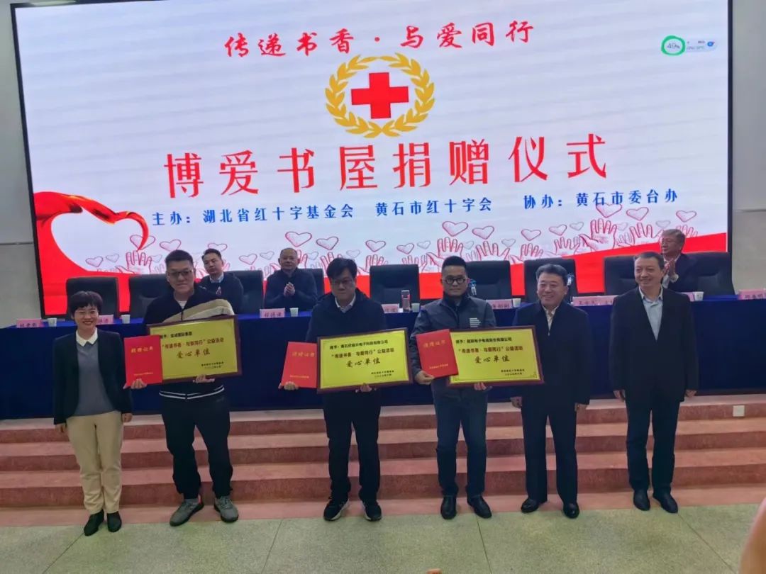 黄石欣益兴电子科技有限公司、超颖电子电路股份有限公司、宝成集团三家企业向下陆区墨斗山学校、开·铁区四棵小学、阳新县官桥小学捐赠了图书共4500册,总价值9万元。仪式现场,市委台办主任程德谦代表爱心企业向三所学校授予爱心书屋牌匾。