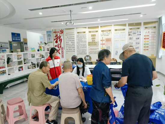 上午 9 点,铜花社区党群服务中心一楼热闹有序,接到楼栋微信群通知的居民早早前来排队领取表格,等候检查。此次义诊涵盖血压测量、血糖检测、肛肠检查及健康咨询等服务。