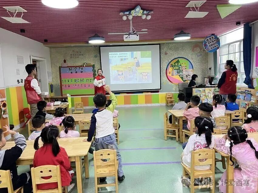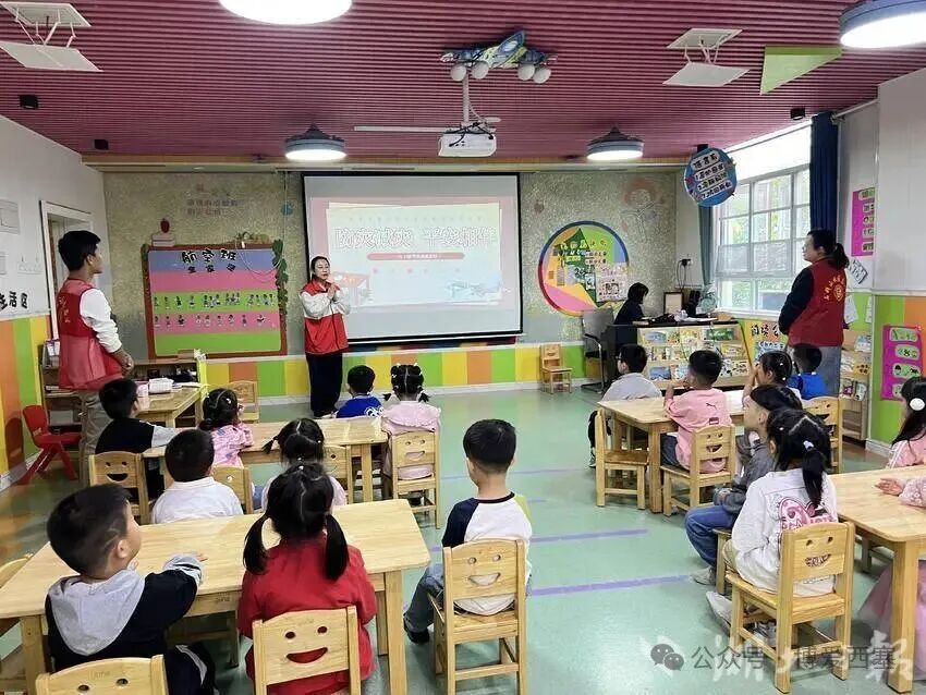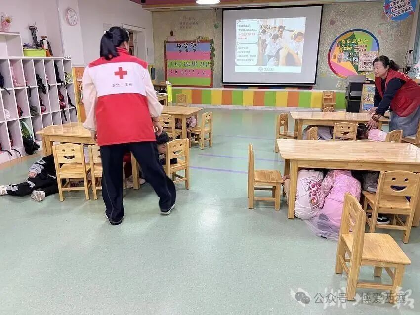 演练启动前,社区红十字会志愿者通过PPT课件,以契合幼儿认知特点的童趣语言,系统讲解地震躲避要点、火灾逃生路线及安全标识识别等知识。通过将专业防灾内容转化为易懂的趣味常识,让孩子们在轻松氛围中快速掌握基础自救技能。