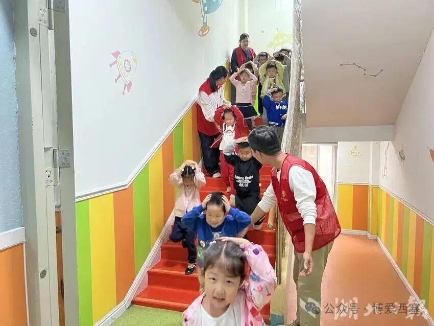 模拟警报声响起,孩子们迅速反应,依照所学知识在课桌下规范采取“伏地、遮挡”姿势紧急避险;警报解除后,在老师与志愿者的有序引导下,孩子们手捂口鼻、保持低姿,沿指定安全路线快速疏散至操场集结区域。