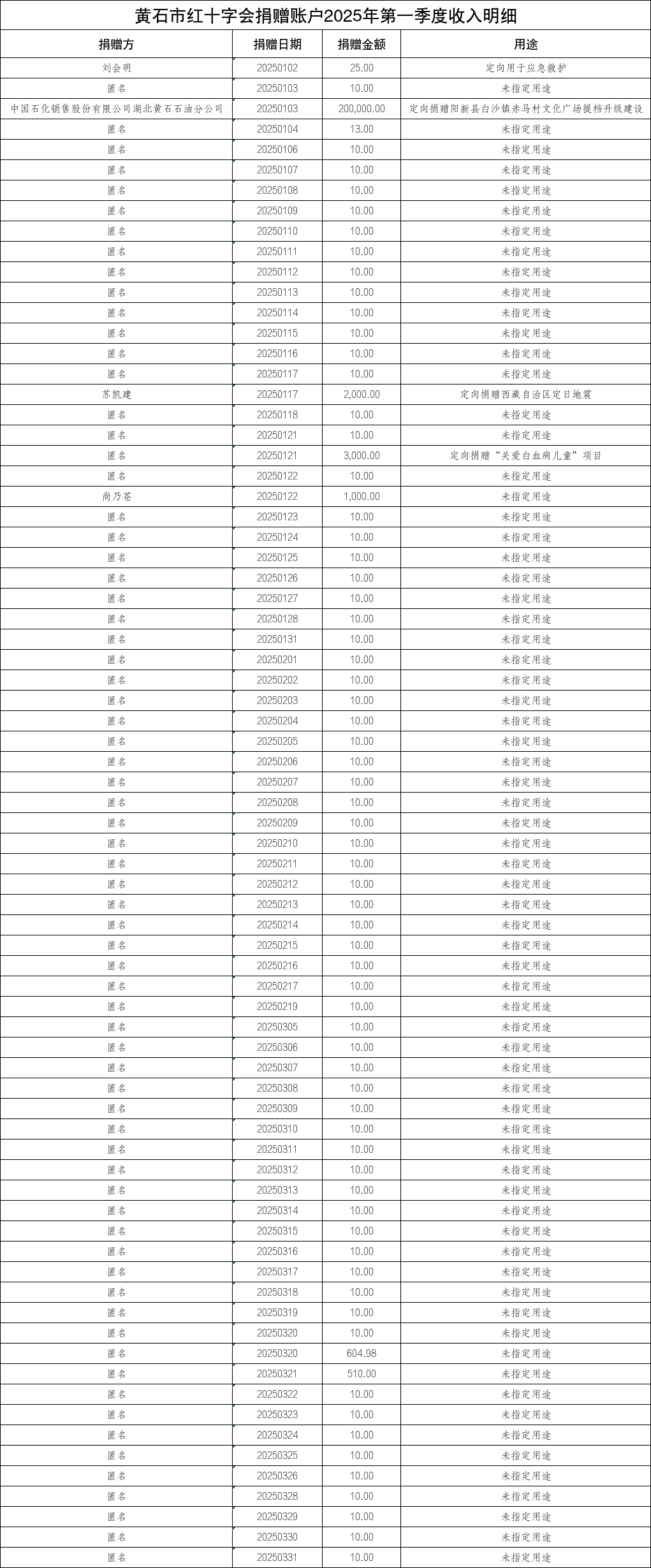 黄石市红十字会捐赠账户2025年第一季度收入明细