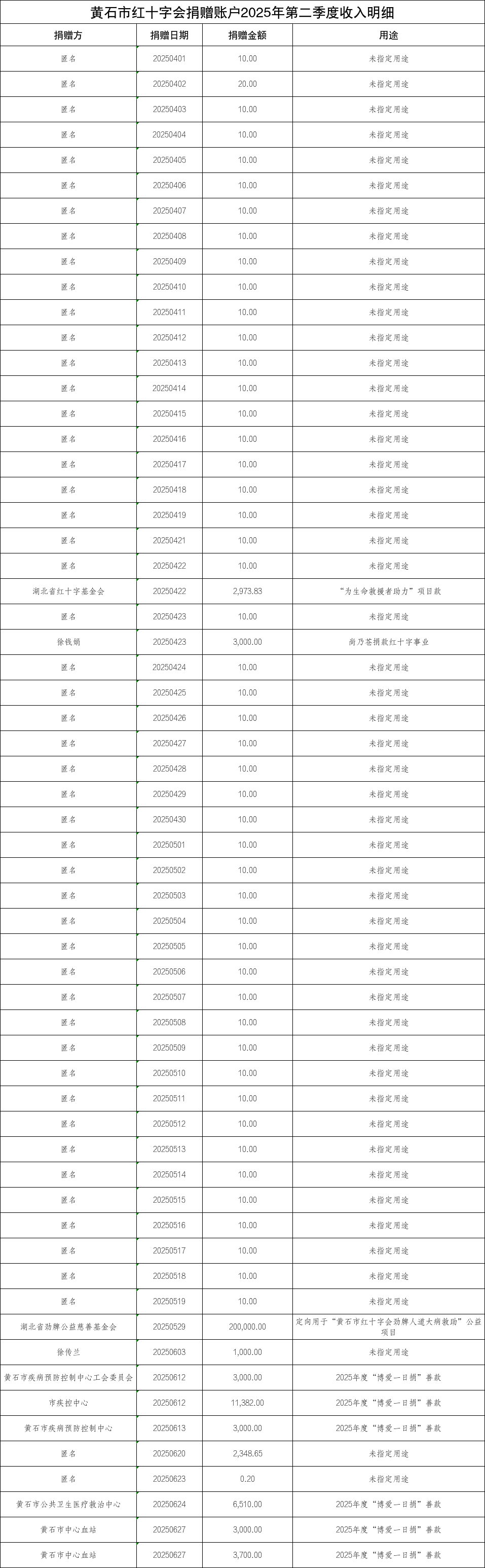 黄石市红十字会捐赠账户2025年第二季度收入明细