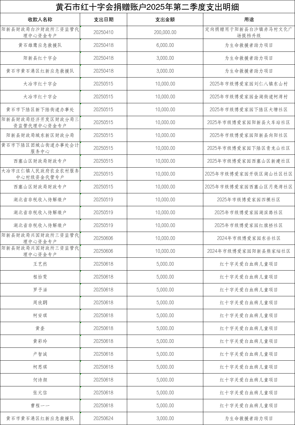 黄石市红十字会捐赠账户2025年第二季度支出明细