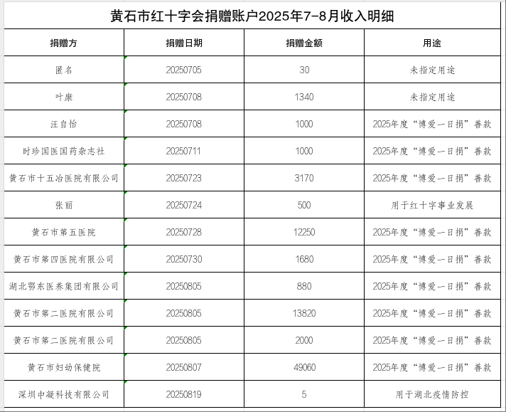 黄石市红十字会捐赠账户2025年7-8月收入明细