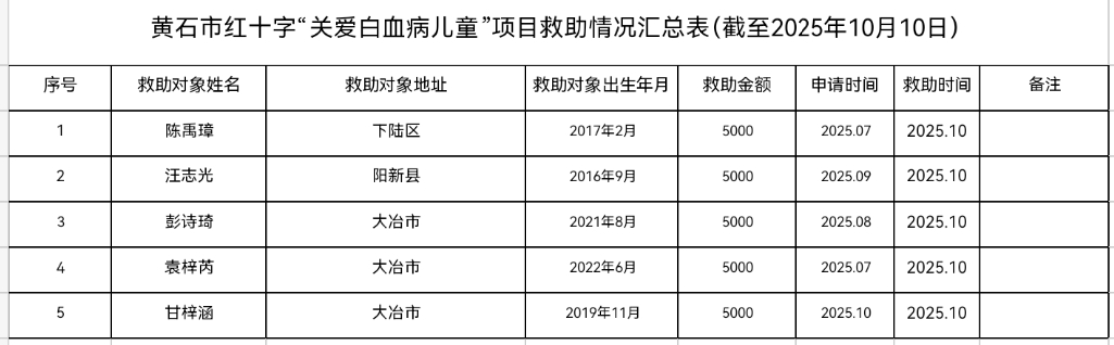 黄石市红十字会2024年7月3日开始执行“关爱白血病儿童”救助项目,截至目前已救助21名白血病儿童,支出资金13.5万元。现将第三批救助对象(5人)名单公示如下。请广大市民予以监督,举报电话:0714-6221833。