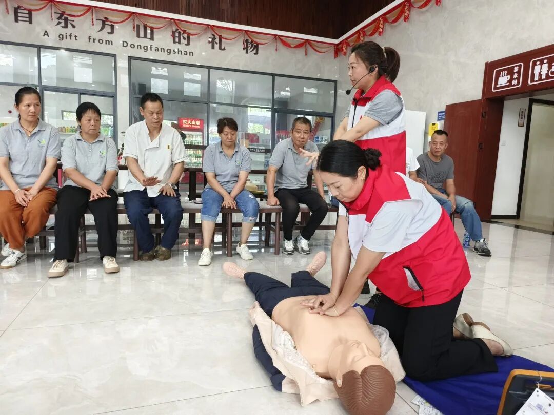 本次培训采取理论与实操相结合的方式。在理论授课环节,红十字会应急救护讲师龚婷围绕“救护概论、心肺复苏、AED的使用、气道异物梗阻急救、创伤救护”等五大核心内容对应急救护的知识和技能进行全面细致地讲解,通过模拟演练救援场景、员工分组实操练习、培训师手把手辅导等方式,清楚直观地展示了心肺复苏操作技术、AED的使用、气道异物梗阻急救及其他意外伤害急救处理技巧,帮助景区员工在遇到突发事件时能够准确迅速采取有效急救措施,提高风险防范意识。